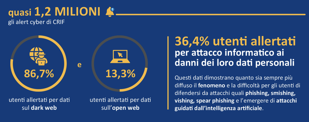 I dati dell’Osservatorio Cyber, rilasciato da CRIF in occasione del mese dedicato alla cybersecurity, confermano infatti che nella prima metà dell’anno in corso sono stati oltre 1 milione gli alert ricevuti da utenti italiani relativamente a un attacco informatico ai danni dei propri dati personali, in crescita del +56,3% rispetto alla precedente rilevazione.
